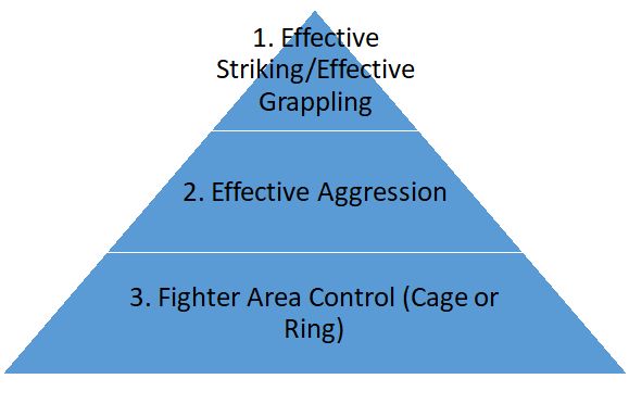 The document itself is very easy to find, and aspects of the document can be seen on UFC broadcasts. But what’s not carried by the UFC (or indeed, many MMA organisations) is the simplistic nature of how a fight is scored. The judging criteria is based upon a three tiered system, that only becomes three tiered if the first and second tiers are not realised. Crucially, Tier One details “Effective Striking/Grappling”, Tier Two details “Effective Aggressiveness” and Tier Three details “Fighter Area Control”, but most fights are scored only on Tier One (as there is usually a clear winner within this criteria). The Tiered system can be viewed below: